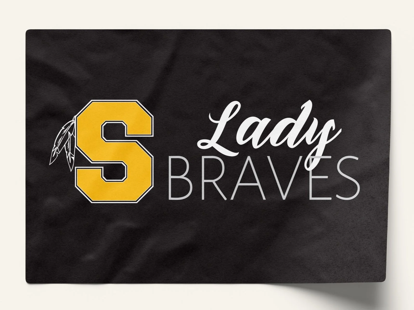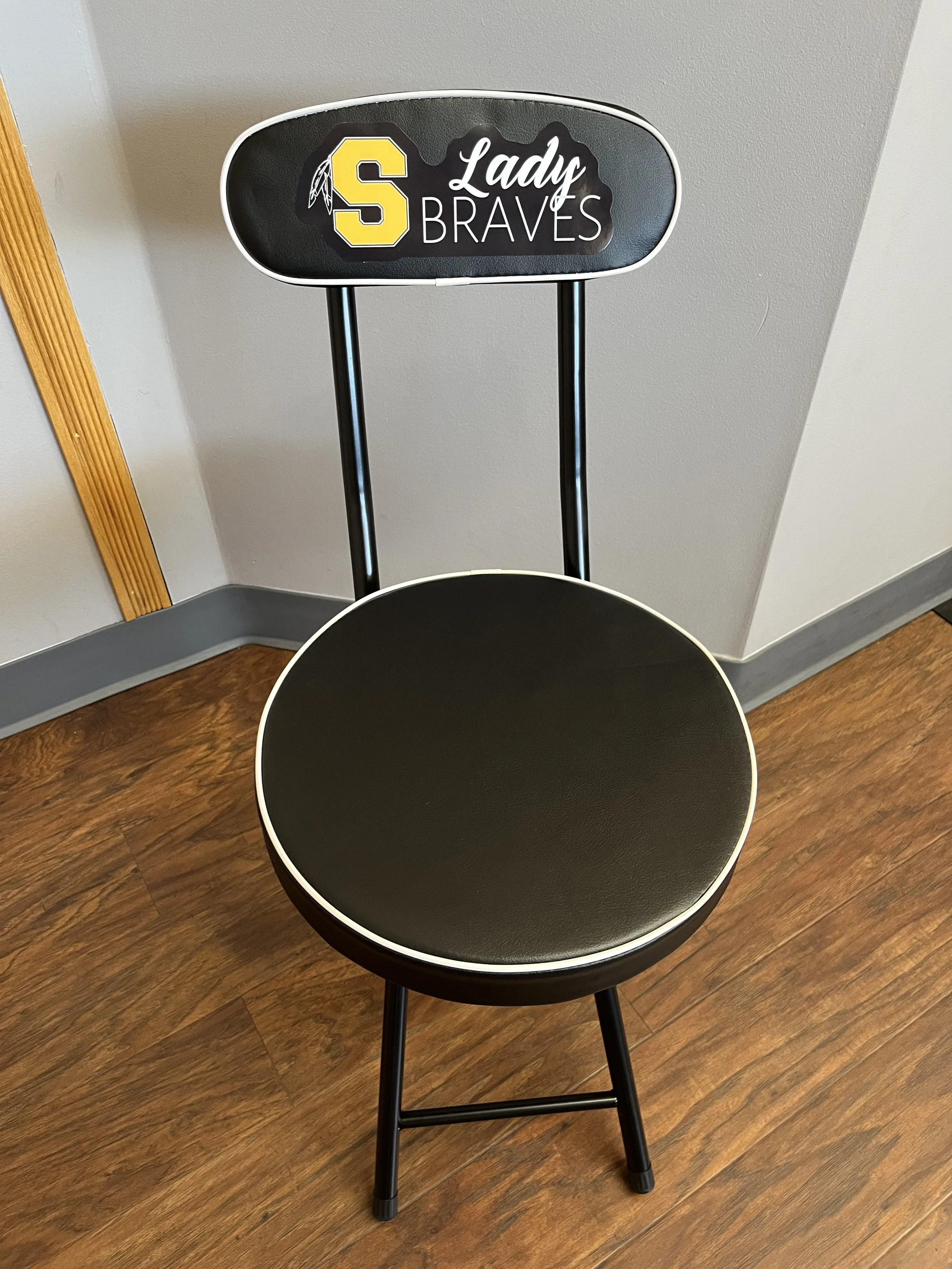 Pictured on the right is the final decal, proudly displayed on the Lady Braves’ seating—enhancing team spirit and program identity.